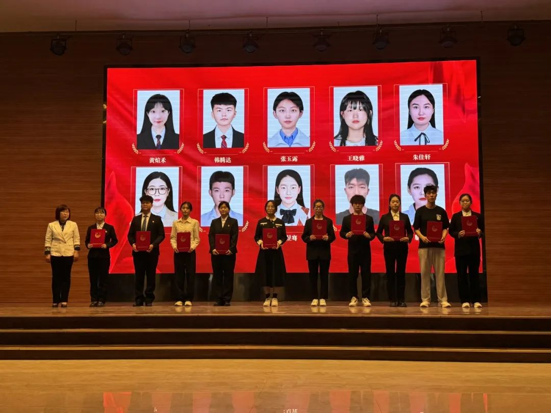 Beat365中文官方网站2022级人力资源管理3班团支书刘雅洁(右3)上台领奖
