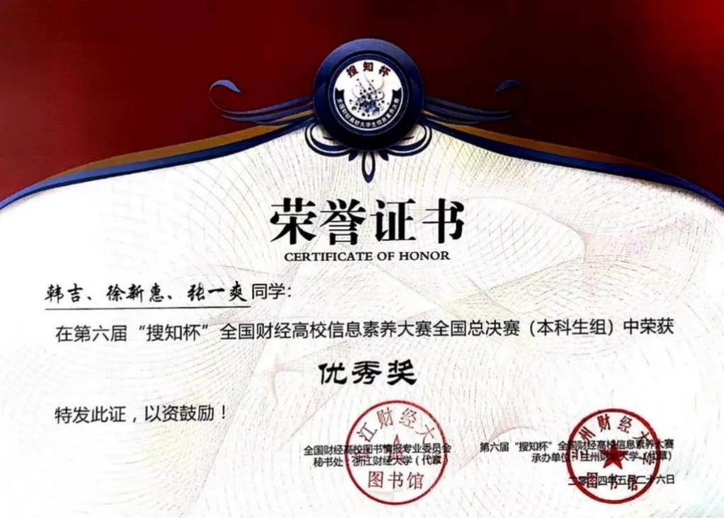近日,由教育部高等学校图书情报工作指导委员会指导,全国财经高校图书情报专业委员会主办,兰州财经大学承办,北京搜知数据科技有限公司提供技术支持的第六届“搜知杯”全国财经高校信息素养大赛总决赛近日圆满落幕。在本次比赛中,Beat365中文官方网站2023级市场营销2班韩吉同学所在团队表现突出,荣获本科生代表队优秀奖。