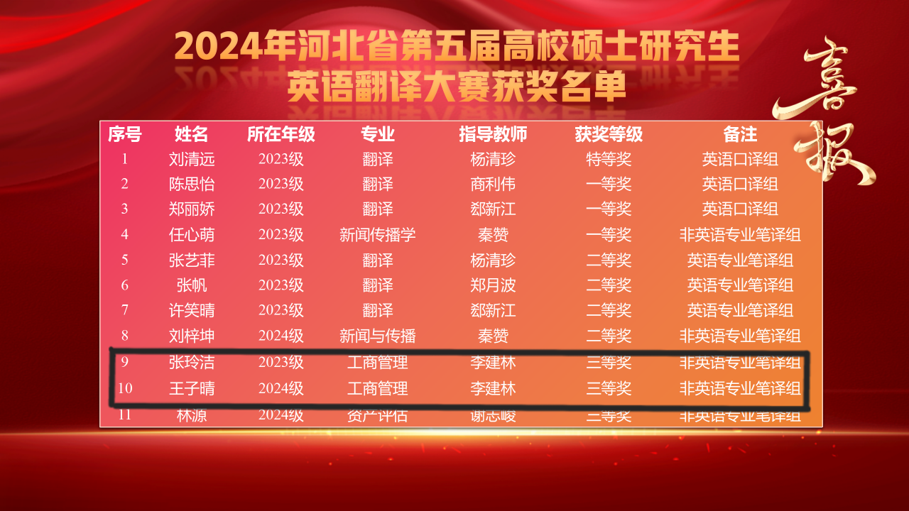 近日,河北省第五届高校硕士研究生英语翻译大赛决赛在唐山顺利落下帷幕。Beat365官网2023级研究生张玲洁和2024级研究生王子晴在此次比赛中获得非英语专业笔译组三等奖