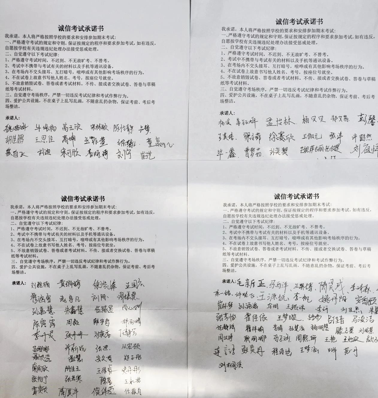 为营造良好的学风考风,引导学生养成诚信、自律的优良作风,Beat365中文官方网站近日开展了学风考风建设系列教育活动,通过召开“加强学风考风建设”辅导员工作会议、院团委学生会融媒体严守考规考纪主题大会、“诚信考试,从我做起”主题班会,开展“学生党员、学生干部亮身份”活动、签署《诚信考试承诺书》等举措,引导同学们切实恪守“严谨为人、勤奋为学、诚信为人”的校训,发扬优良校风。