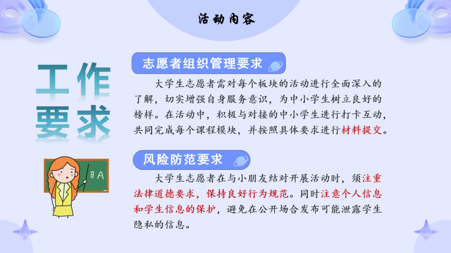 会议伊始,孟庆友介绍了本次活动的宗旨与流程,强调大学生志愿者们要积极热情,乐于奉献,耐心细致,时刻践行志愿服务精神。随后,他从“云育未来”“红领巾爱祖国——美时美刻”“幸福人生魔法书”“我的春节”“膳食小博士”“云端工厂的数字漫游”“元宵花灯赏”多个科普板块和美育板块向大家说明了云讲堂活动的具体内容并明确了志愿者们的工作要求,强调志愿者们在志愿服务过程中要注重法律道德要求,保持良好行为规范,注意个人信息和学生信息的保护。
