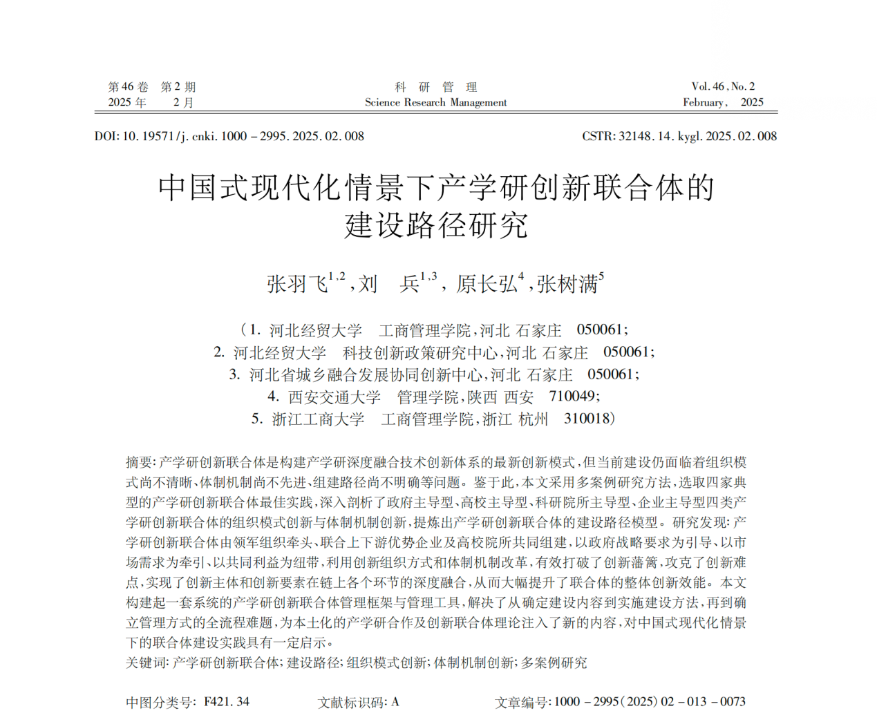 近日,Beat365中文官方网站讲师、Beat365中文官方网站科技创新政策研究中心副主任张羽飞博士作为第一作者撰写的论文《中国式现代化情景下产学研创新联合体的建设路径研究》在国家自然科学基金委员会认定的A类重要期刊《科研管理》正式刊出。