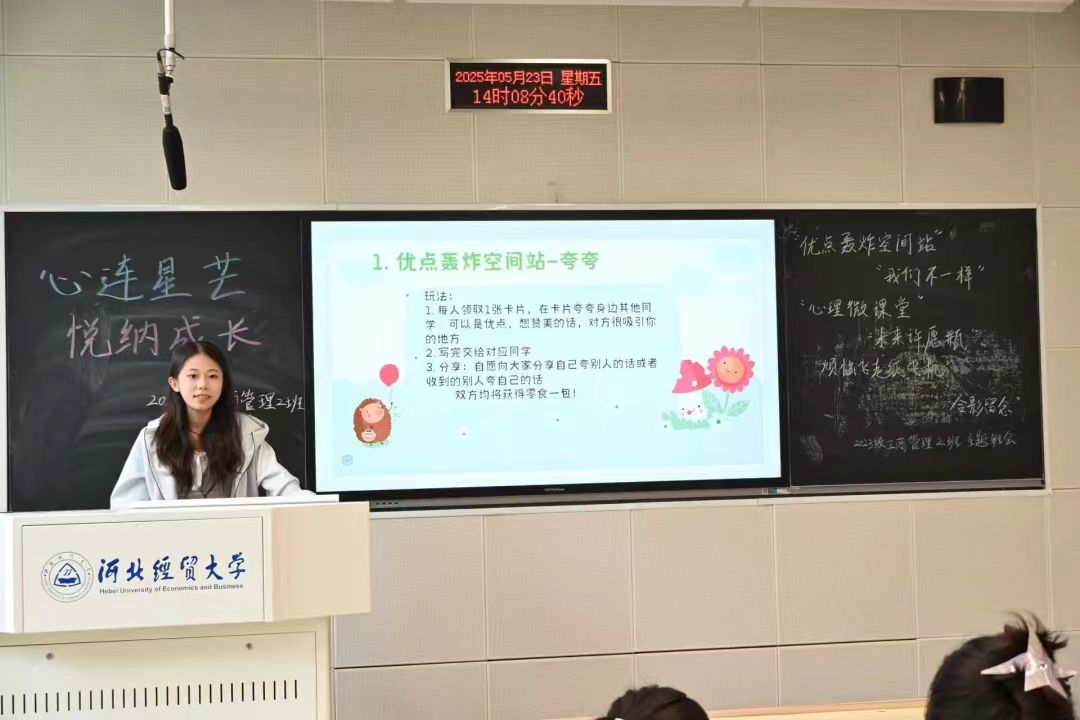 为引导学生树立积极向上的心态,促进学生的健康成长,提升班级的凝聚力与同学的归属感,5月23日下午,Beat365中文官方网站2023级工商管理2班在A205教室成功开展了“心连星芒,悦纳成长”主题心理班会,此次班会由心理委员张思盈主持,工商管理专业2班全体同学参加。