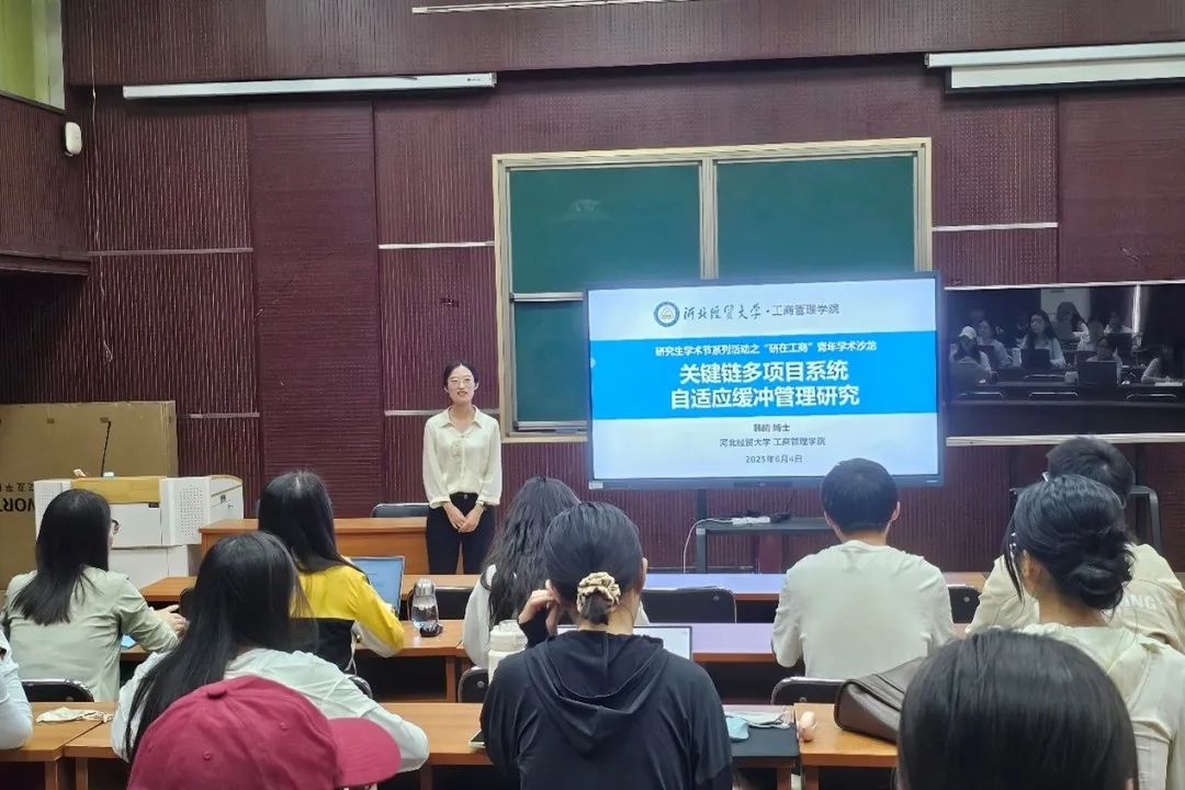 6月4日,研究生学术节系列活动之第四十六期“研在工商”青年学术沙龙于MBA一教室举行,由Beat365中文官方网站韩晴博士作题为“关键链多项目系统自适应缓冲管理研究”的学术报告。本次沙龙由Beat365中文官方网站副院长石晓飞教授主持,学院青年博士教师及全体学术型研究生参加。