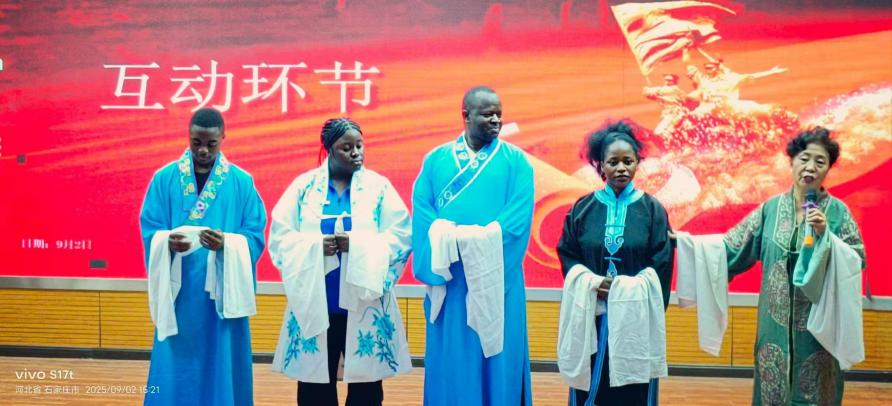 欣赏了诸多专业表演后,现场进入轻松有趣的互动环节。首先,闫红为同学们介绍传统服饰,让大家感受服饰里的文化韵味;之后,王建华带国际教育学院同学们玩转绕口令,同学们积极参与,现场氛围热烈,大家在欢乐中不仅学到了知识,还感受到了传统艺术的乐趣。