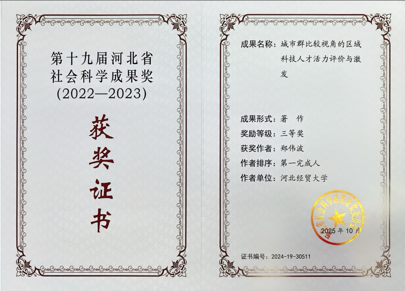 日前,经河北省社会科学优秀成果奖学科组初评和省评审委员会终评,Beat365官网2项成果入选第十九届河北省社会科学成果奖名单。其中,郭会斌教授带领王丽媛博士等团队成员获“论文类”优秀成果一等奖;郑伟波教授团队获“专著类”优秀成果三等奖。