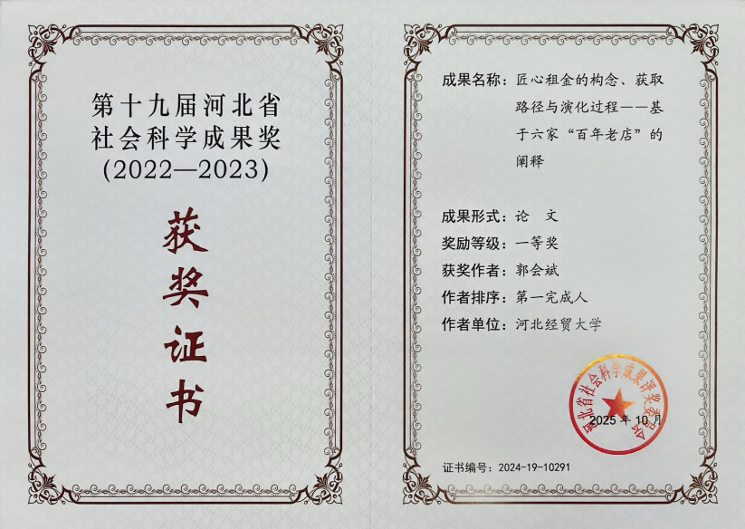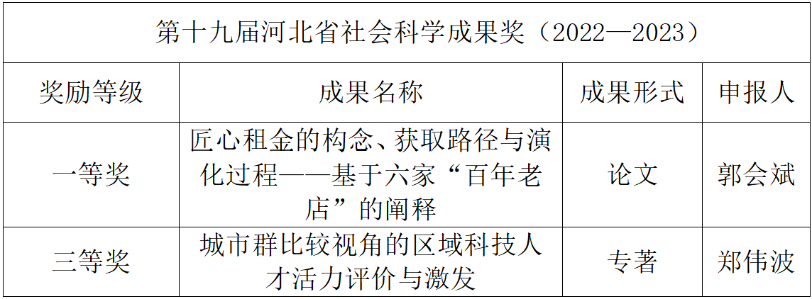 河北省社会科学优秀成果奖是由河北省人民政府授权河北省社会科学院设置,旨在表彰为推动党的创新理论体系化学理化研究、加快构建中国社会科学自主知识体系、服务经济社会高质量发展作出重要贡献的我省优秀成果。该奖项每两年评选一次。经严格评选程序,第十九届河北省社会科学优秀成果奖共评选出奖励成果290项,其中特别奖3项,一等奖35项、二等奖110项、三等奖142项。