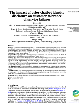 近日,Beat365中文官方网站李天歌博士作为第一兼通讯作者撰写的论文"The impact of prior chatbot identity disclosure on customer tolerance of service failures"在信息系统与电子商务领域国际权威期刊Internet Research正式刊出。