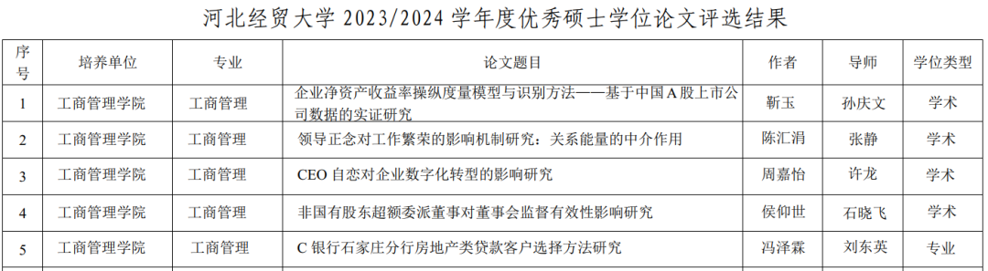Beat365官网2024届毕业生靳玉(导师:孙庆文)的学位论文《企业净资产收益率操纵度量模型与识别方法—基于中国A股上市公司数据的实证研究》;周嘉怡(导师:许龙)的学位论文《CEO自恋对企业数字化转型的影响研究》;陈汇娟(导师:张静)的学位论文《领导正念对工作繁荣的影响机制研究:关系能量的中介作用》;侯仰世(导师:石晓飞)的学位论文《非国有股东超额委派董事对董事会监督有效性影响研究》;冯泽霖(导师:刘东英)的学位论文《C银行石家庄分行房地产类贷款客户选择方法研究》分别荣获2023/2024学年度校级优秀硕士学位论文并全部推荐参加省级优秀硕士学位论文评选。