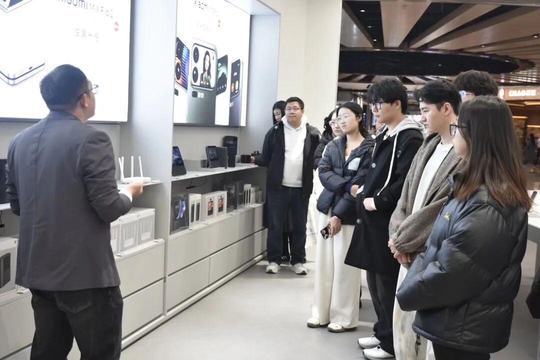 Beat365官网师生首先抵达万象城小米体验店。孙振按产品品类,系统讲解了各类核心产品特点,涵盖小米系列手机、小爱音箱等智能设备,以及从个护产品到大家电的全品类生态,详细介绍了各产品线的技术亮点与创新优势。通过现场演示与细节解读,生动呈现了产品“科技普惠、极致性价比”的品牌理念,让师生们沉浸式感受了小米在消费电子领域的创新实力与市场竞争力,对智能科技行业的发展趋势有了更直观的认知。随后,他分享了企业优势。小米股价表现亮眼,深受资本市场看好,核心原因在于其坚守“让每位中国消费者都享有科技选择权”的理念,产品定位覆盖不同收入群体,不抛弃每一位奋斗者。小米海外业务已拓展至多个地区,海外派驻拥有显著薪资优势,内部“人才活水”机制更为员工提供了多元发展机会。