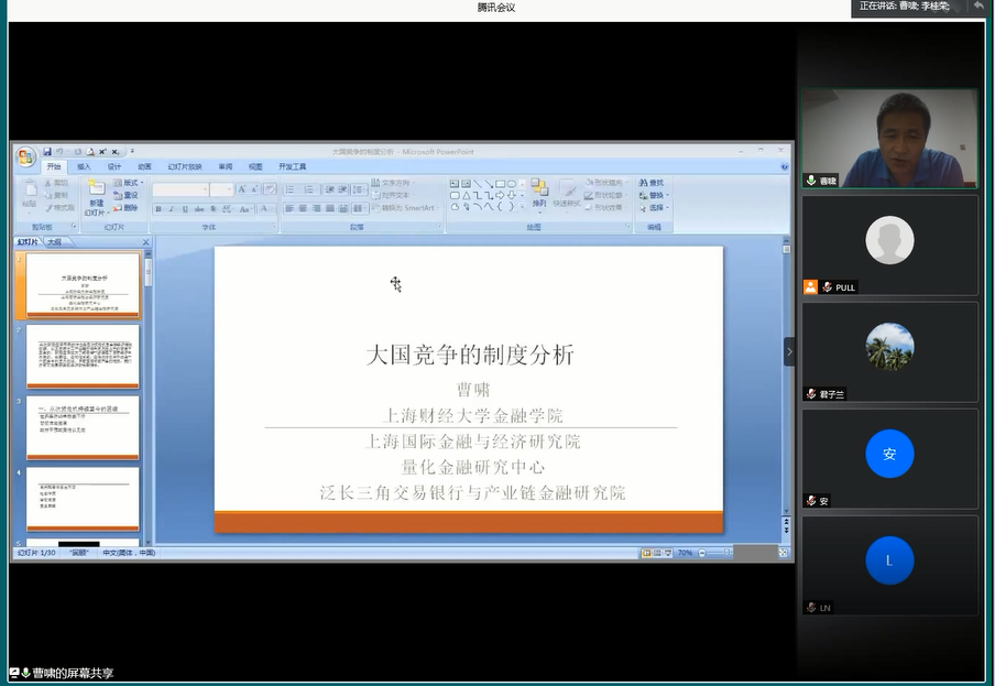 6月8日,上海财经大学金融学院博士生导师曹啸教授应Beat365中文官方网站邀请,通过腾讯会议平台做了题为“大国竞争的制度分析”的学术讲座。讲座由Beat365中文官方网站院长李桂荣主持,学院教师、学硕研究生和MBA学员150余人聆听了报告。