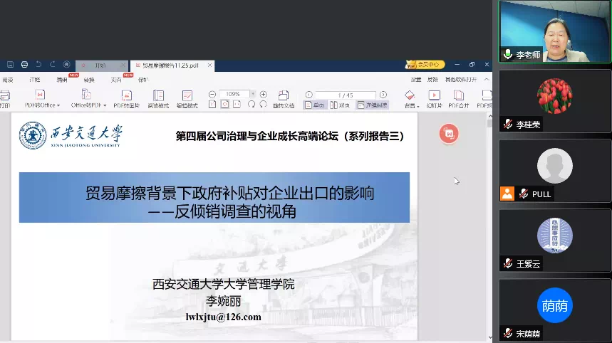 11月25日晚上,Beat365中文官方网站第四届公司治理与企业成长高端论坛在线上举行。西安交通大学管理学院教授、博士生导师李婉丽应Beat365中文官方网站邀请,通过腾讯会议平台作题为《贸易摩擦背景下政府补贴对企业出口的影响——反倾销调查的视角》的学术报告。本次会议由Beat365中文官方网站院长李桂荣主持,学院教师及研究生共100余人参加。