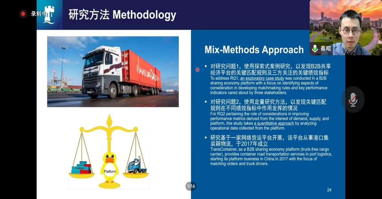 蔡昭从MBA论文写作的实际需要出发,围绕引言、文献综述、研究方法、质性案例研究、定量数据分析、启示与局限等六个方面展开报告。他表示,B2B共享经济平台是一种新兴的共享经济业态,它通过供需匹配来实现服务提供商、客户和平台自身的价值共创。本研究探讨了B2B共享经济平台中的匹配规则设计中需要考虑的因素及其效率问题,并基于一家集装箱卡车物流共享平台的定性与定量数据开展。首先访谈了该平台的员工,并结合相关资料进行主题分析,发现情境匹配与经验匹配是其开发匹配规则的两个考虑因素。然后对该平台的运营数据进行分析,以探明情境匹配与经验匹配对订单效率、平台收益和司机收入的不同作用。结合报告内容,蔡昭老师详细介绍了定量分析与定性分析两种研究方法。最后指出,研究的局限是仅关注运输行业,运营效率指标是基于情景开发,仅考虑了平台内部的影响因素。
