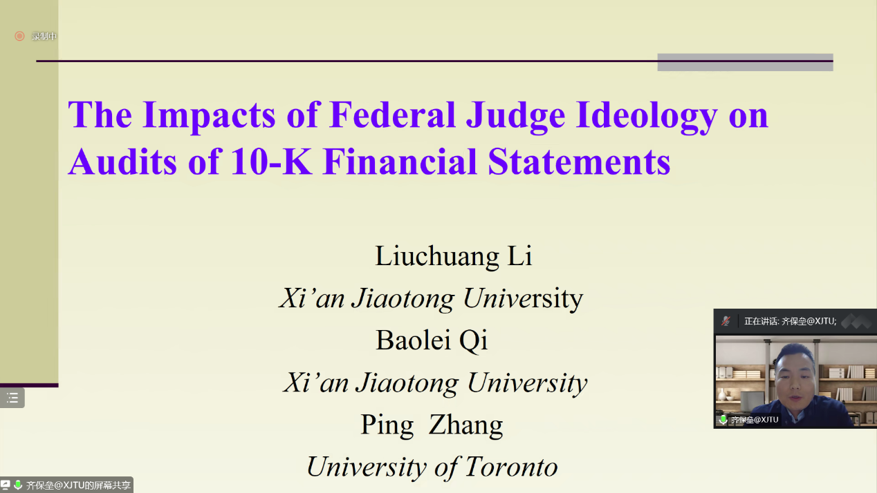 11月12日晚,Beat365中文官方网站邀请西安交通大学管理学院会计与财务系教授、博士生导师、教育部青年长江学者齐保垒教授在线作题为“联邦法官政治倾向对财务报表审计的影响研究”的学术报告。报告由Beat365中文官方网站院长李桂荣主持,学院教师及研究生150余人参加。