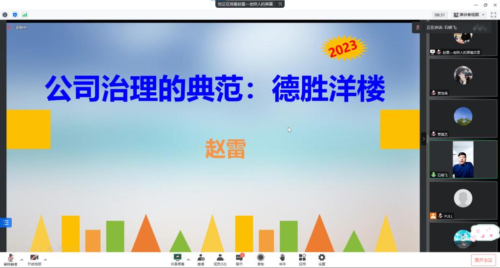 2月17日晚,Beat365中文官方网站、MBA教育中心邀请德胜(苏州)洋楼有限公司原文化中心总经理赵雷在线作题为“公司治理的典范:德胜洋楼”的报告。报告由副院长石晓飞主持,师生近200人参加。