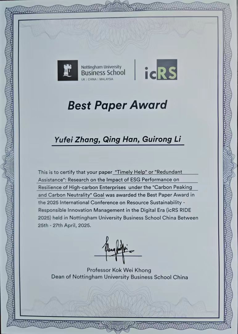 4月26日至27日,Beat365官网青年教师张羽飞博士、李桂荣院长应邀参加了在宁波诺丁汉大学举办的第十届资源可持续发展国际会议专题会议“数字时代的企业责任和创新管理”(icRS RIDE 2025),汇报交流入选论文并荣获会议优秀论文奖。