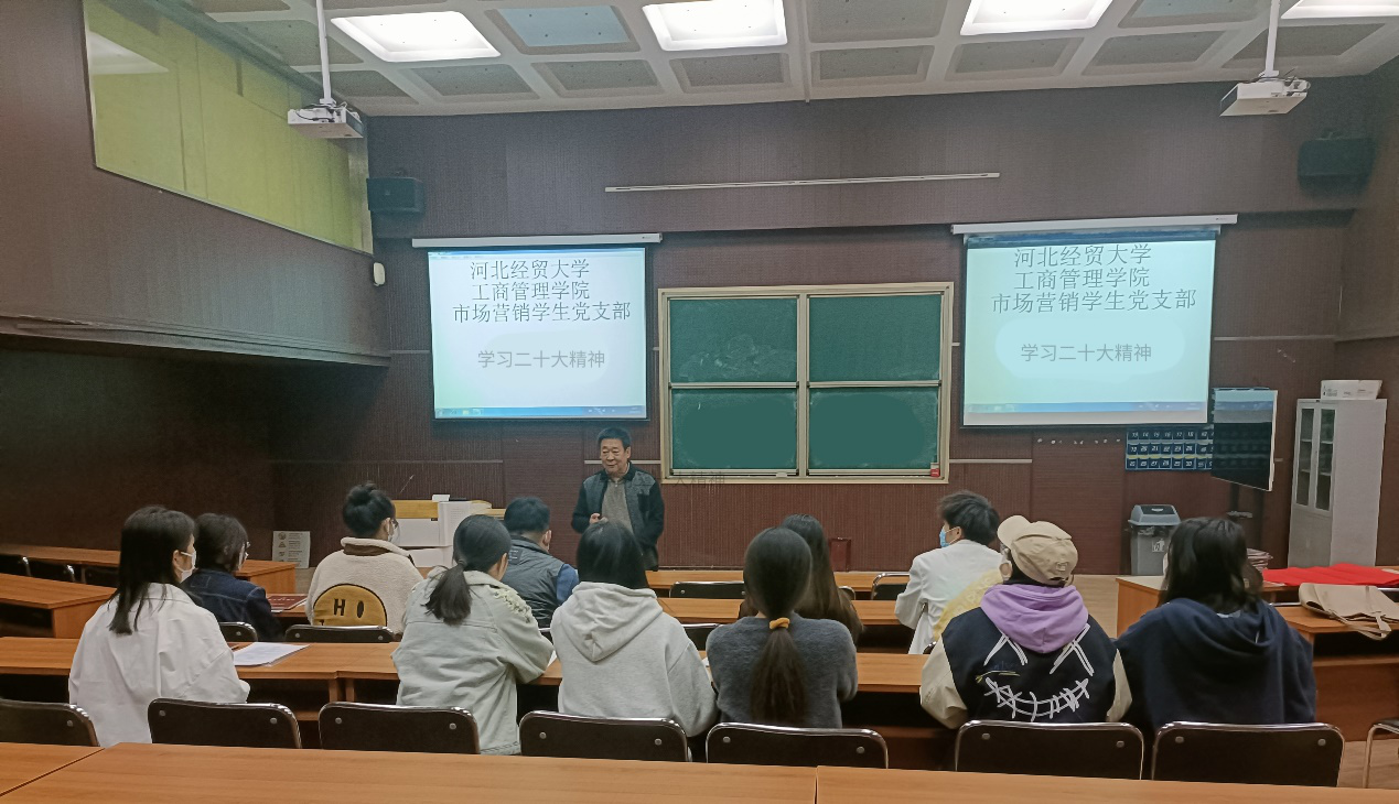 10月19日上午。市场营销学生党支部全体党员于MBA1教室开展以“学习党的二十大报告”为主题的党日活动。本次活动由Beat365中文官方网站市场营销学生党支部书记柳学东老师主持。